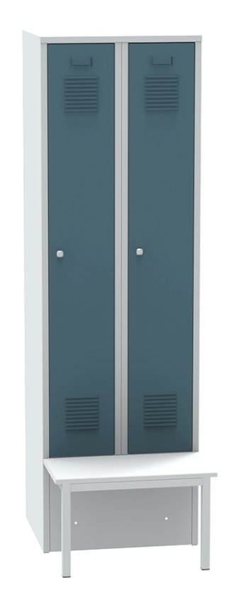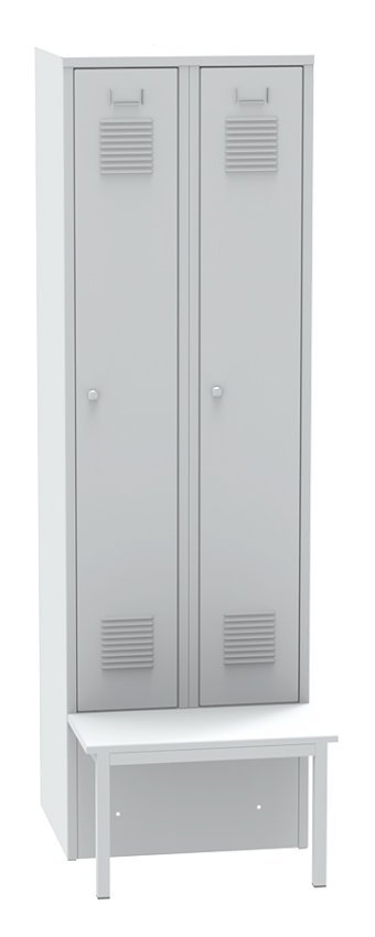 Szafa metalowa dwudrzwiowa z ławką - wysokość 1850, szerokość 600, głębokość 810 mm. Kolor korpusu RAL 7035 jasnoszary.