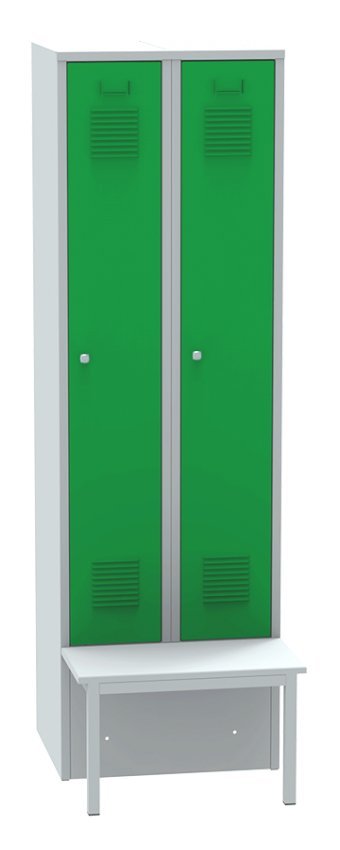Dwudrzwiowa szafa metalowa z ławką, szerokość 500, wysokość 2085, głębokość 810 mm. Kolor korpusu RAL 7035 jasnoszary.