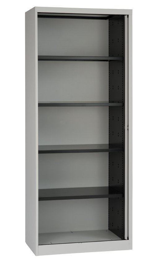 Szafa żaluzjowa metalowa z żaluzjami poziomymi z czterema półkami, szerokość 800, wysokość 1980, głębokość 430 mm, różne kolory.