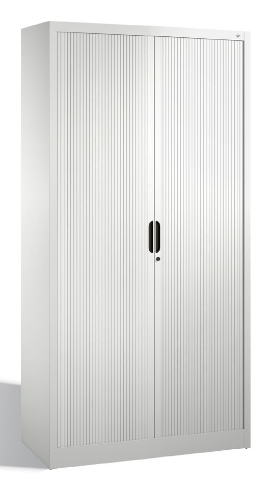 Metalowa szafa żaluzjowa dwudrzwiowa. Wysokość 1980, szerokość 1000, głębokość 420 mm. Cztery półki. Kolor korpusu i żaluzji jasnoszary RAL 7035/antracyt RAL 7021.