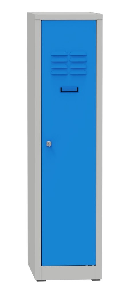 Szafka spawana, wysokość 1500 x szerokość 400 x głębokość 500 mm. Zamykanie na zamek bębenkowy lub kłódkę, wyposażenie wewnętrzne: półki, drążek na wieszaki i haczyk + przegroda pionowa do oddzielania odzieży czystej i brudnej. Na zamówienie z nogami spawanymi - wysokość szafy z nogami 1650 mm. Kolor korpusu RAL 7035 jasnoszary.