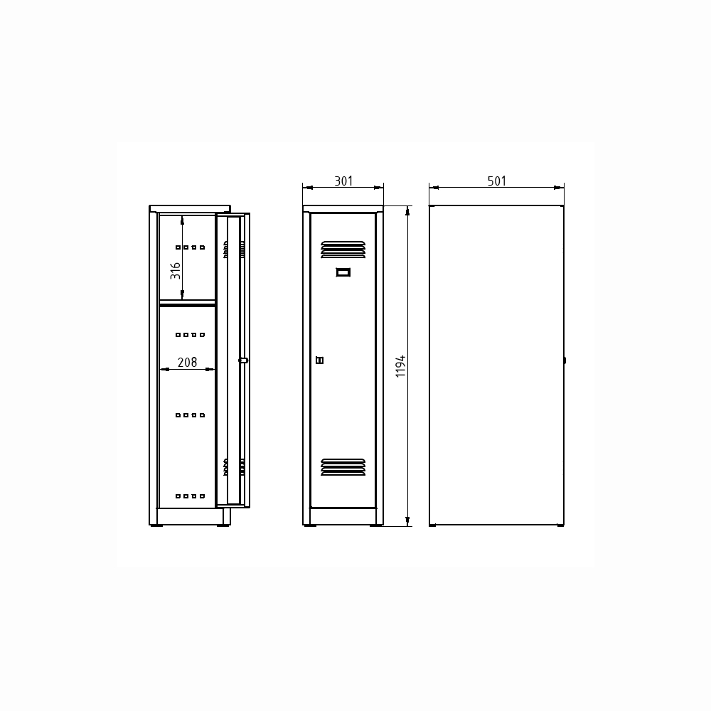 Szafka spawana o wys. 1200 x szer. 400 x gł. 500 mm. Zamykanie na zamek bębenkowy lub kłódkę, wyposażenie wewnętrzne: półki, drążek na wieszaki i haczyk + przegroda pionowa do oddzielania odzieży czystej i brudnej. Na zamówienie z nogami spawanymi - wysokość szafki z nogami 1350 mm. Kolor korpusu RAL 7035 jasnoszary.