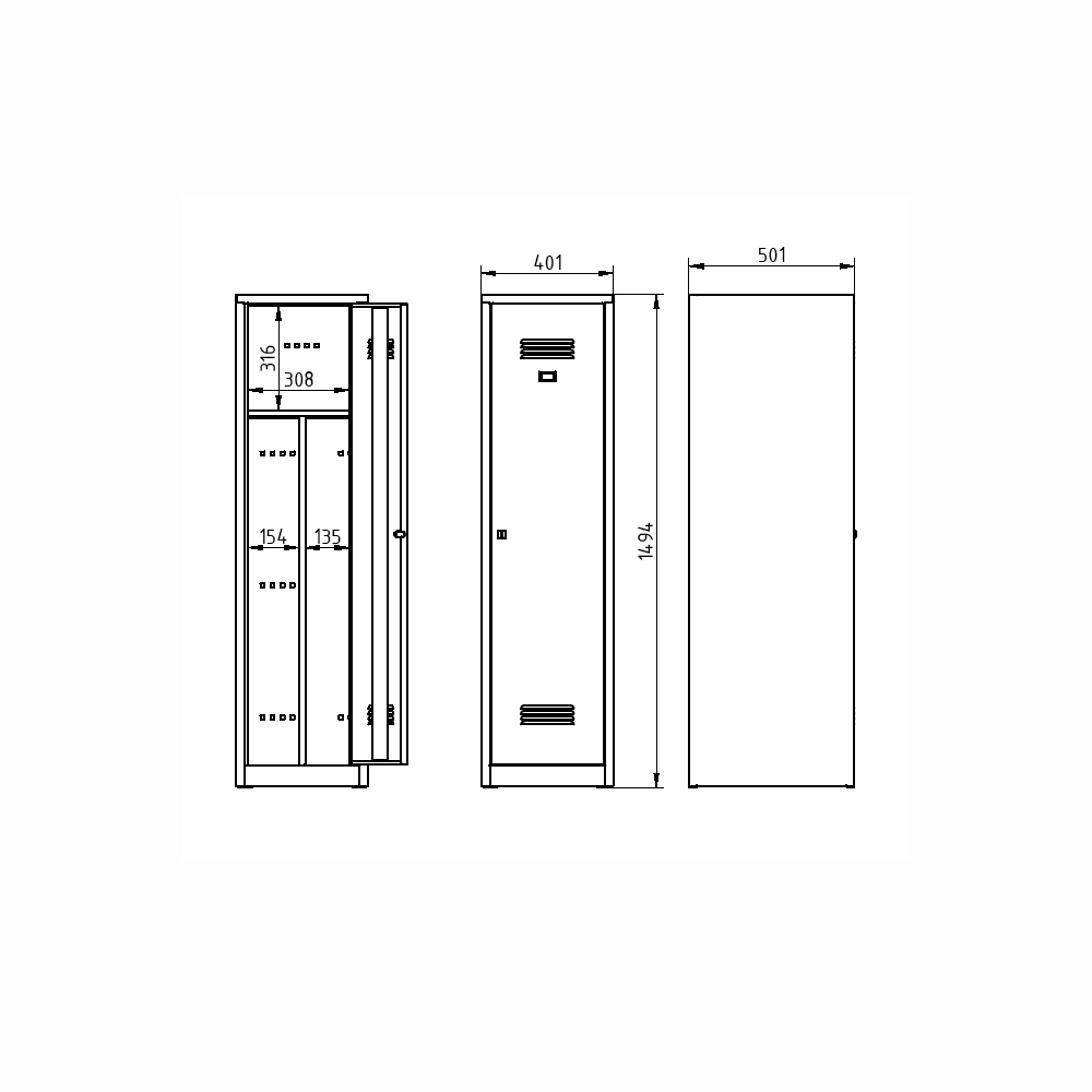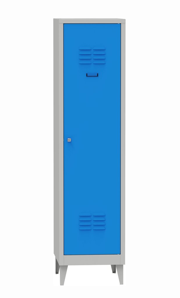 Szafka spawana, wysokość 1500 x szerokość 400 x głębokość 500 mm. Zamykanie na zamek bębenkowy lub kłódkę, wyposażenie wewnętrzne: półki, drążek na wieszaki i haczyk + przegroda pionowa do oddzielania odzieży czystej i brudnej. Na zamówienie z nogami spawanymi - wysokość szafy z nogami 1650 mm. Kolor korpusu RAL 7035 jasnoszary.
