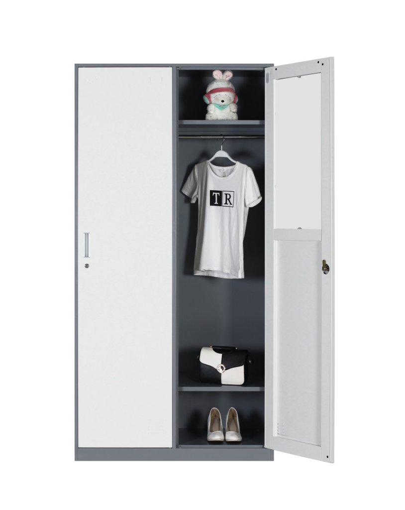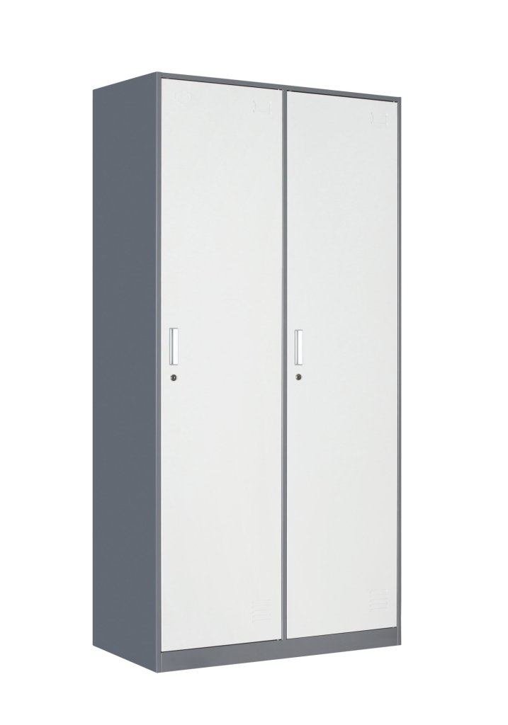 Dwuczęściowa szafa spawana, wysokość 1800 x szerokość 600 x głębokość 493 mm. Zamykanie zamkiem cylindrycznym z dwoma kluczami lub zamkiem obrotowym na kłódkę. Kolor korpusu jasnoszary, drzwi z laminatu HPL w kolorze niebieskim, jasnozielonym lub jasnopomarańczowym. W każdej sekcji znajduje się zagięcie zapobiegające wepchnięciu drzwi do środka i otwarciu zamka.