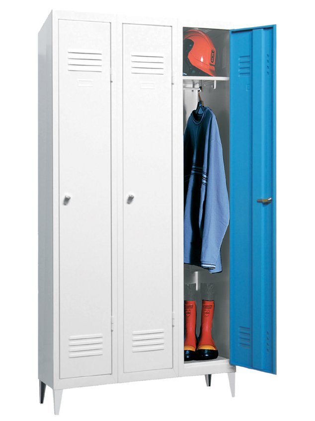 Szafa spawana, trzydrzwiowa, wys. 1200 x szer. 1200 x gł. 500 mm. Zamek bębenkowy lub na kłódkę, wyposażenie wnętrza - półki, drążek na wieszaki i haczyk + przegroda pionowa do oddzielania odzieży czystej i brudnej. Na zamówienie z nogami spawanymi - wysokość szafki z nogami 1350 mm. Kolor korpusu RAL 7035 jasnoszary.