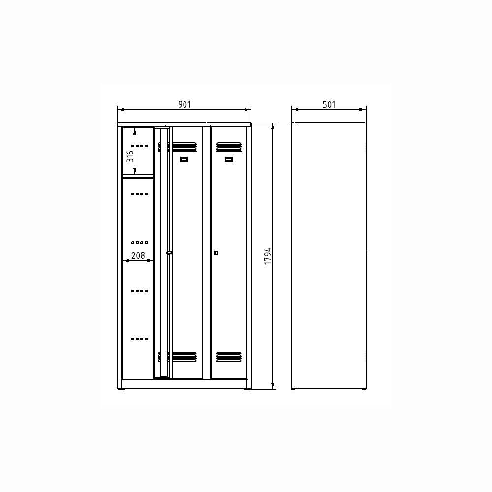 Szafa spawana, trzydrzwiowa, o wys. 1500 x szer. 900 x gł. 500 mm. Zamek bębenkowy lub kłódka, wyposażenie wnętrza każdej przegródki - półki, drążek na wieszaki i haczyk. Na zamówienie z nogami spawanymi - wysokość szafy z nogami 1650 mm. Kolor korpusu RAL 7035 jasnoszary.