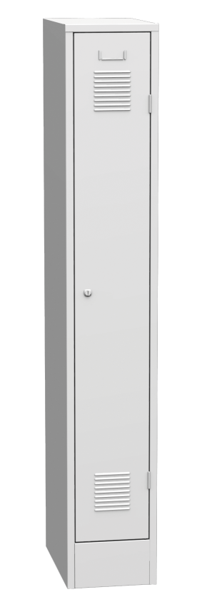 Szafka metalowa BHP jednodrzwiowa na cokole, szerokość 300, wysokość 1850, głębokość 500 mm, wewnętrzna przegroda do oddzielania odzieży czystej i brudnej. Drzwi standardowo wyposażone są we wzmocnienie zwiększające wytrzymałość, żaluzje wentylacyjne zapewniające skuteczną wentylację oraz listwę z papierową tabliczką znamionową. Drzwi zawieszane są na zawiasach zewnętrznych, na życzenie klienta istnieje możliwość zawieszenia ich także na zawiasach wewnętrznych. Za dopłatą istnieje możliwość wyposażenia drzwi w inny rodzaj otworów wentylacyjnych dla uatrakcyjnienia wyglądu. Aby zwiększyć bezpieczeństwo, należy rozciągnąć wzmocnienie na całej długości drz\wi lub wymienić drzwi na dwuwarstwowe. Kolor korpusu RAL 7035 jasnoszary.