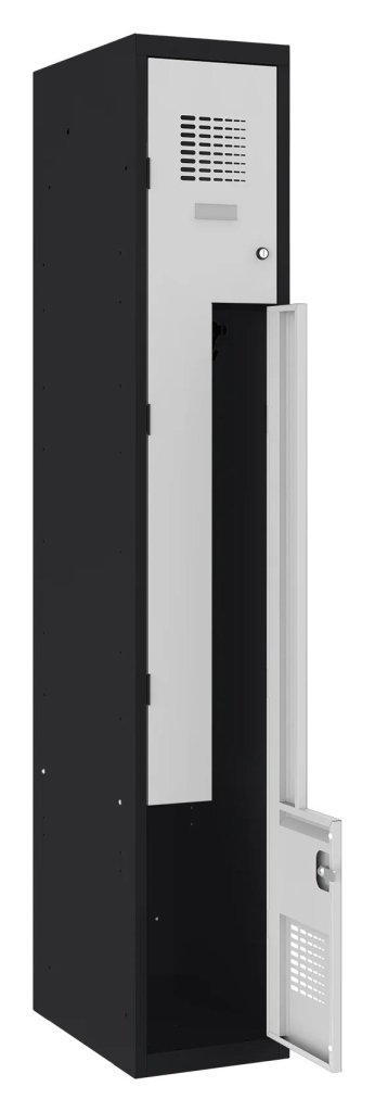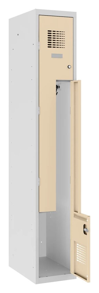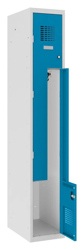 Szafka metalowa BHP dwudrzwiowa o konstrukcji spawanej i nowoczesnej konstrukcji systemu wentylacji. Idealny do małych pomieszczeń. Wysokość 1800 x szerokość 300 x głębokość 500 mm. Standardowe wyposażenie szafki: drążek z haczykami, plakietka samoprzylepna. Do wyboru 16 odcieni kolorów. Zamek bębenkowy lub zamknięcie na kłódkę.