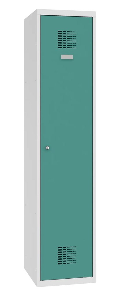Szafka metalowa pracownicza jednodrzwiowa o konstrukcji spawanej z nowoczesnym systemem wentylacji. Wysokość 1800 x szerokość 300 x głębokość 500 mm. Standardowe wyposażenie szafy: drążek z haczykami, półki nad drążkiem, samoprzylepna tabliczka z imieniem. 16 odcieni kolorów. Różne rodzaje zamnków.