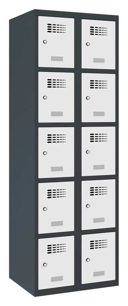 Szafka metalowa pracownicza dziesięciodrzwiowa o konstrukcji spawanej z nowoczesnym systemem wentylacji. Wysokość 1800 x szerokość 600 x głębokość 500 mm. Samoprzylepna plakietka imienna na drzwiach. Do wyboru 16 odcieni kolorystycznych wliczonych w cenę. Różne rodzaje zamków.