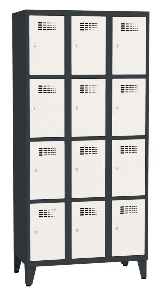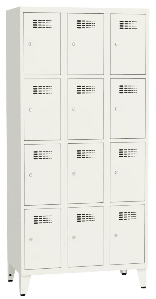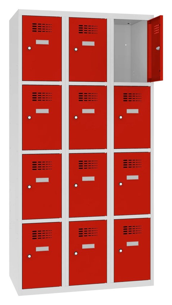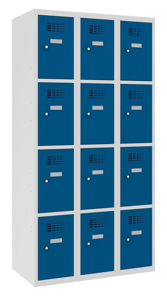 12-drzwiowa szafka metalowa o konstrukcji spawanej z nowoczesnym systemem wentylacji. Wysokość 1800 x szerokość 1200 x głębokość 500 mm. Samoprzylepna plakietka imienna na drzwiach. Do wyboru 16 odcieni kolorystycznych wliczonych w cenę. Różne rodzaje zamków.