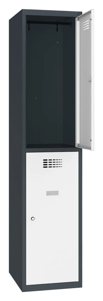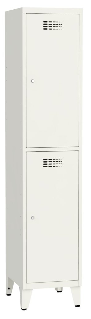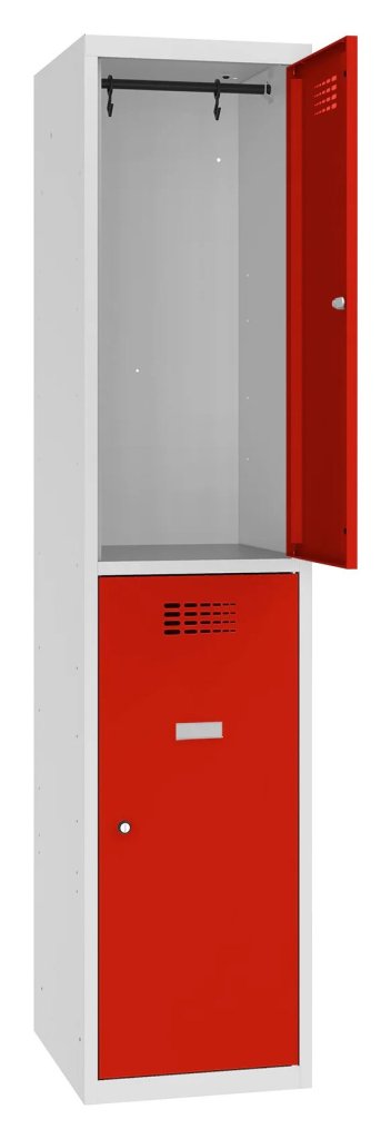 Szafka metalowa pracownicza dwudrzwiowa o konstrukcji spawanej z nowoczesnym systemem wentylacji. Wysokość 1800 x szerokość 400 x głębokość 500 mm. Standardowe wyposażenie szafki: drążek z haczykami, plakietka samoprzylepna. Zamek bębenkowy lub zamknięcie na kłódkę.