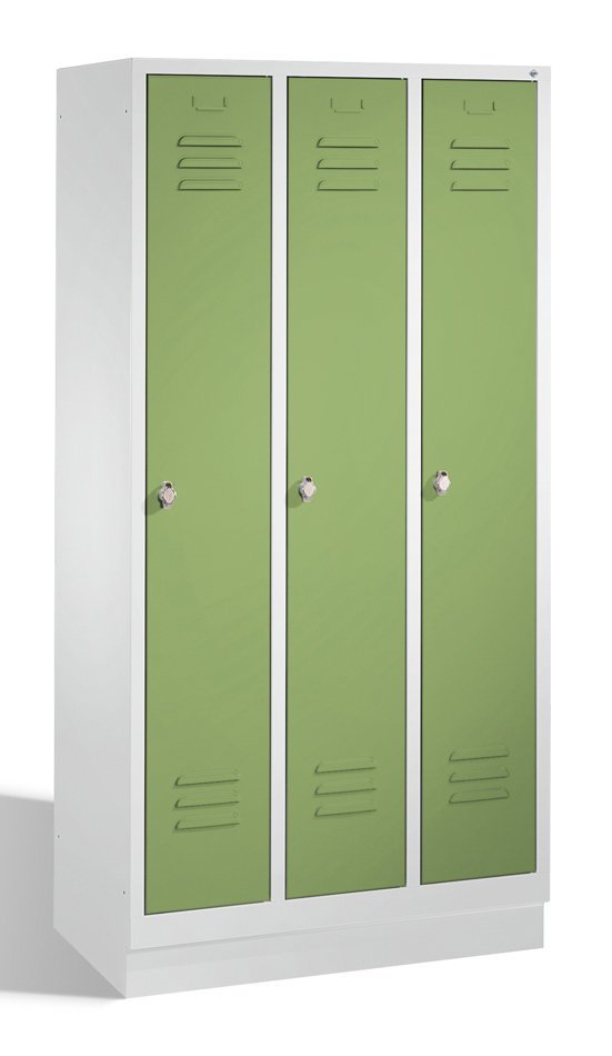 Szafka pracownicza metalowa trzydrzwiowa na cokole, szerokość 750, wysokość 1850, głębokość 500 mm. Kolor korpusu RAL 7035 jasnoszary.
