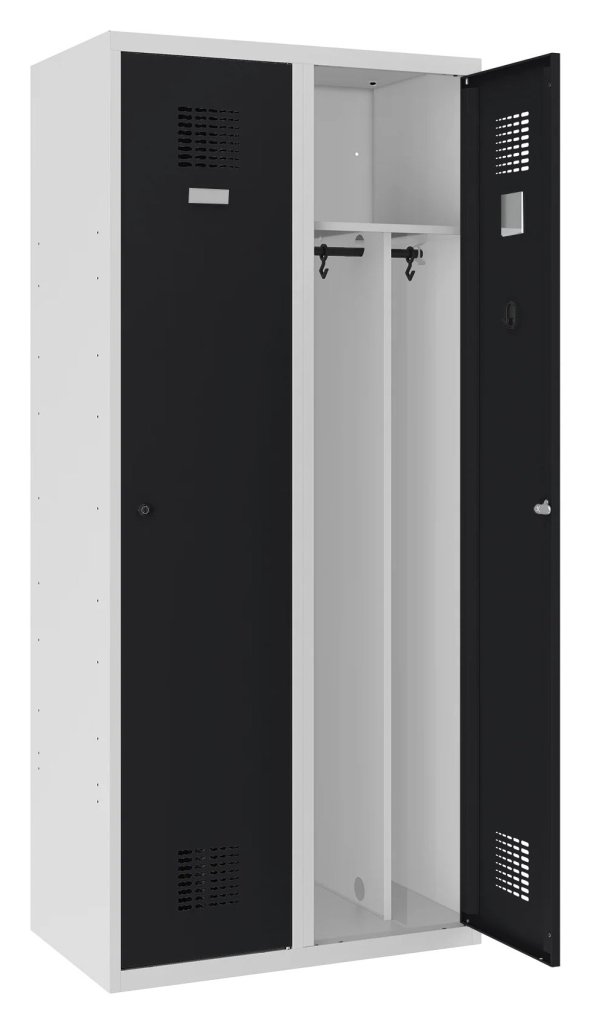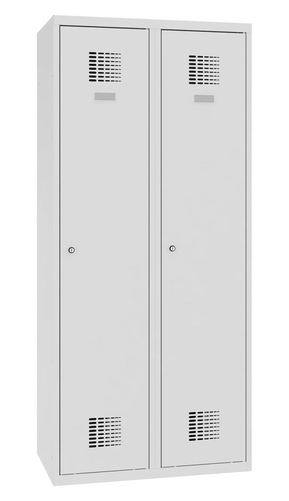 Szafka BHP pracownicza metalowa dwudrzwiowa o konstrukcji spawanej z nowoczesnym systemem wentylacji. Wysokość 1800 x szerokość 800 x głębokość 500 mm. Standardowe wyposażenie szafki: wewnętrzna przegroda do oddzielania prania czystego i brudnego, drążek z dwoma haczykami, wieszak na ręcznik, lustro, półka nad drążkiem, samoprzylepna plakietka na imię. Zamek bębenkowy lub zamknięcie na kłódkę. Na stanie w kolorze RAL 7035 jasnoszarym.