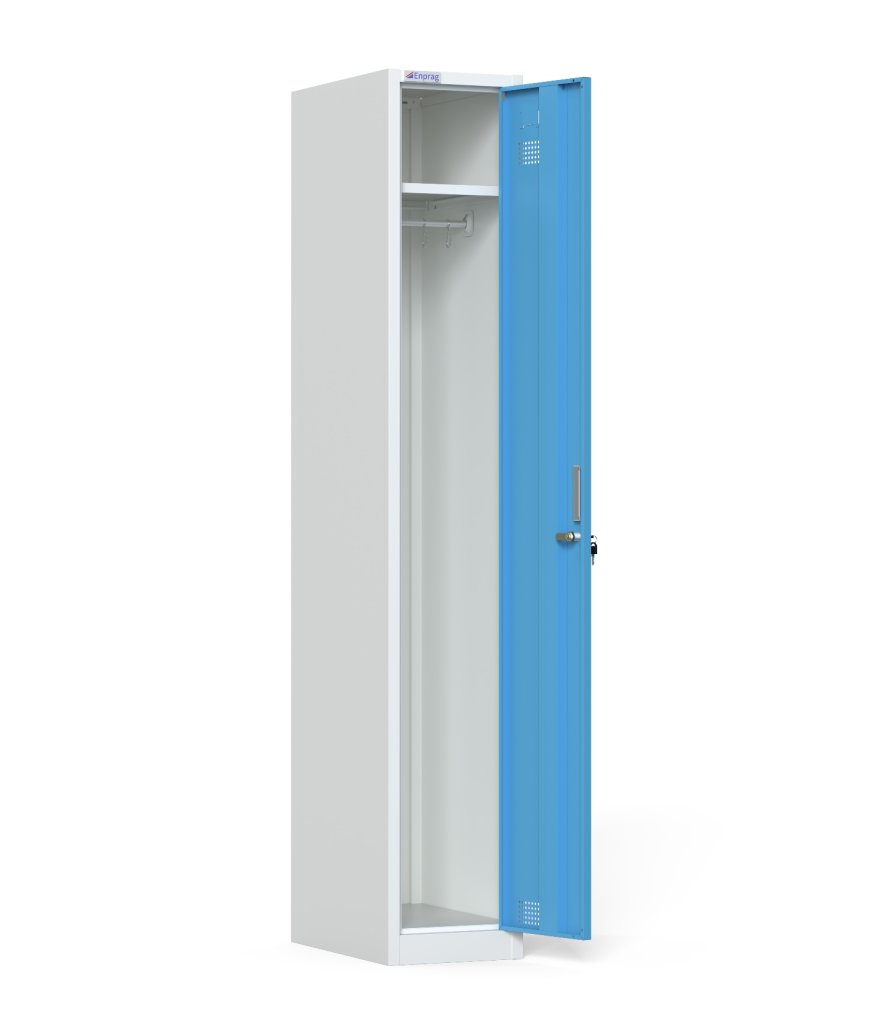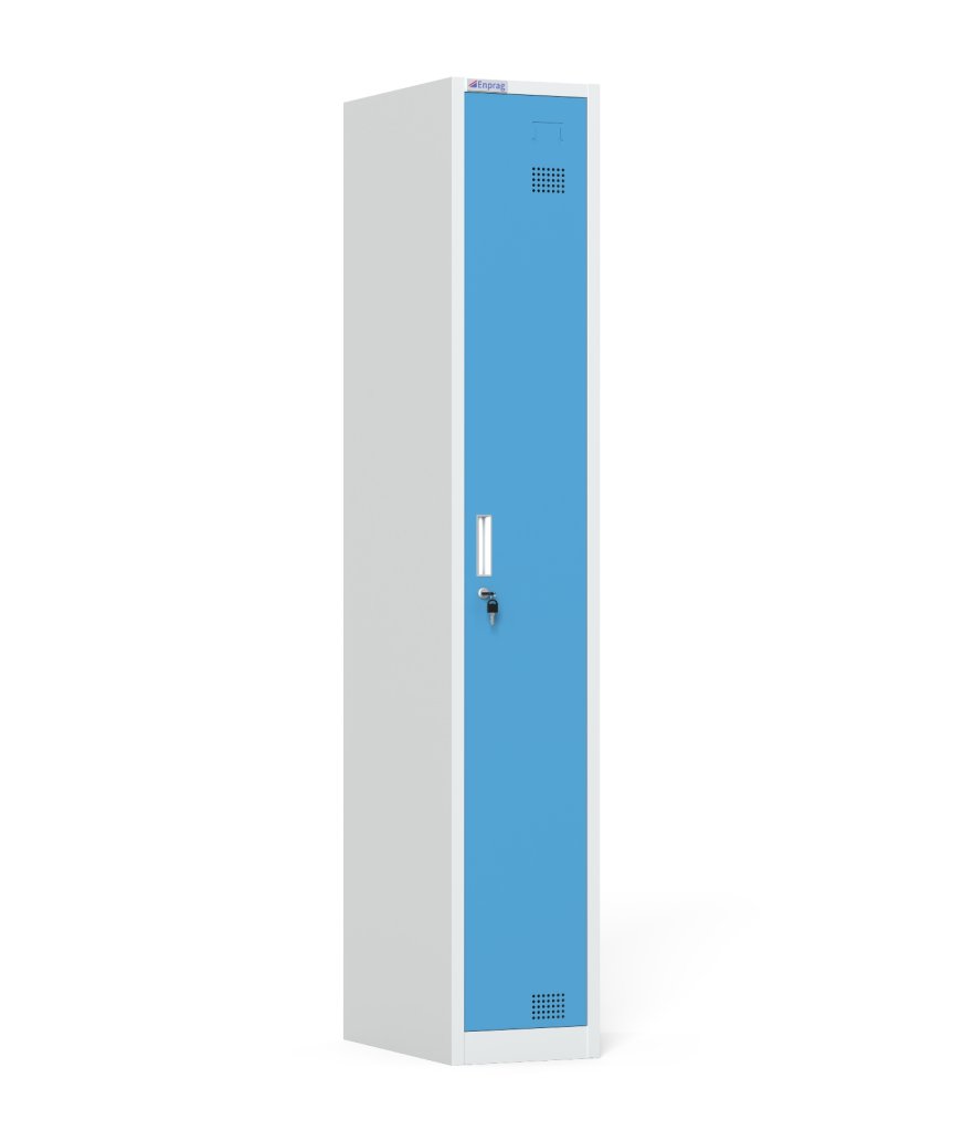 Szafka metalowa BHP wysokość 1800 x szerokość 300 x głębokość 500 mm. Zamykanie zamkiem bębenkowym z dwoma kluczami. Malowanie proszkowe szary RAL 7047/niebieski RAL 5015.
