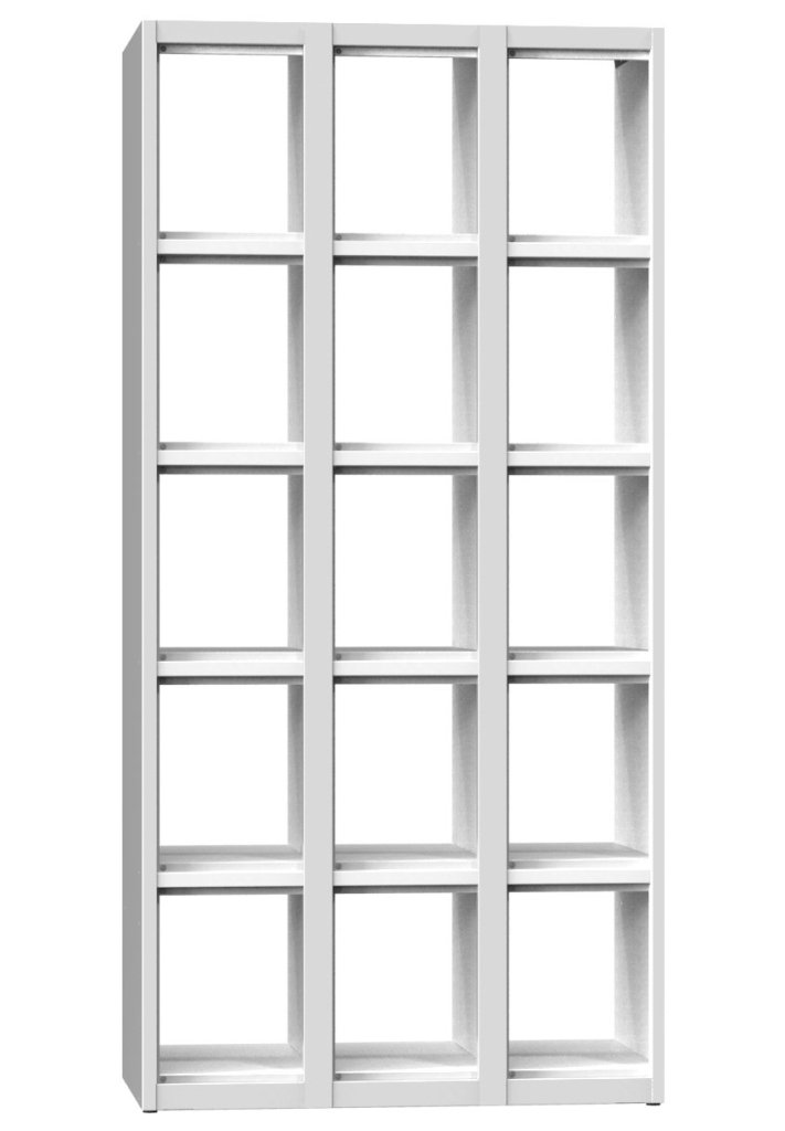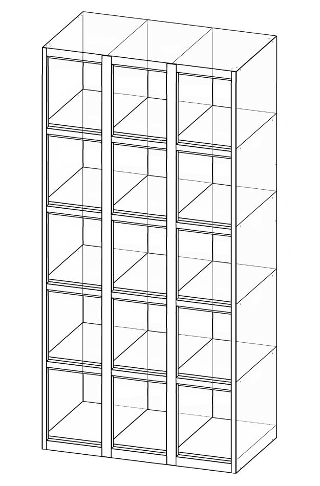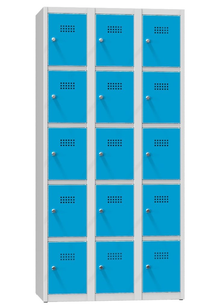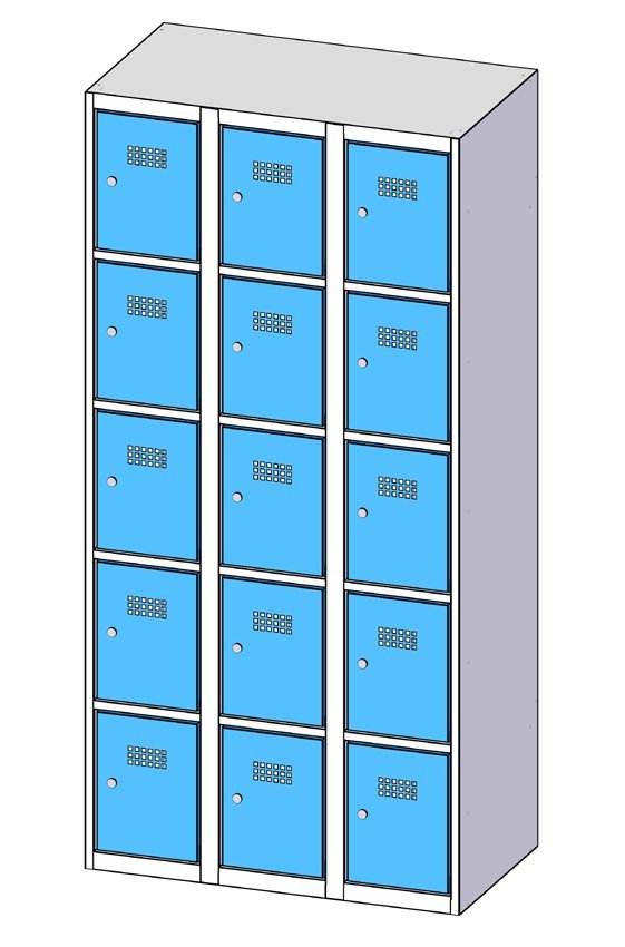 Szafka metalowa z piętnastoma zamykanymi schowkami, szerokość 900, wysokość 1850, głębokość 500 mm. Szerokość schowka 300 mm, standardowy zamek można zastąpić kłódką lub zamkiem na monety. Kolor korpusu RAL 7035 jasnoszary.