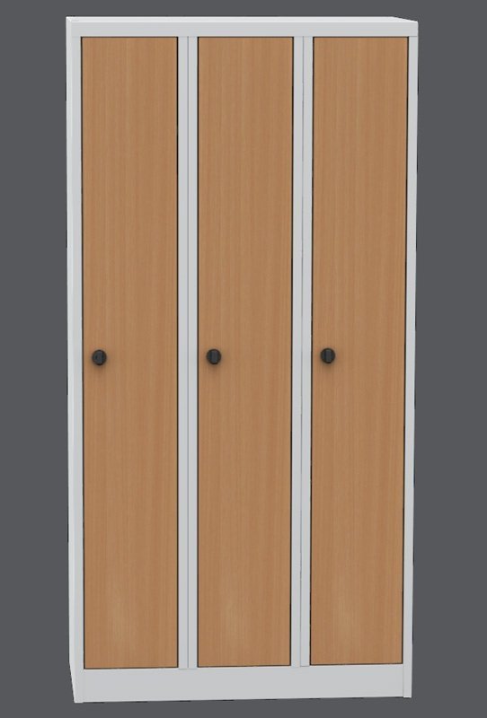 Szafka BHP pracownicza metalowa trzykomorowa, spawana, o szerokości 900 mm (szerokość przedziałów - 300 mm), wysokości 1800 mm i głębokości 500 mm. Zamek cylindryczny z dwoma kluczami lub zamek obrotowy na kłódkę. Kolor korpusu jasnoszary, drzwi laminowane buk lub wiśnia. W każdym przedziale znajduje się zagięcie zapobiegające wepchnięciu drzwi do środka i otwarciu zamka.
