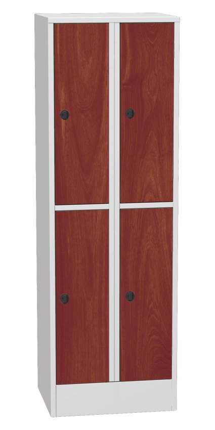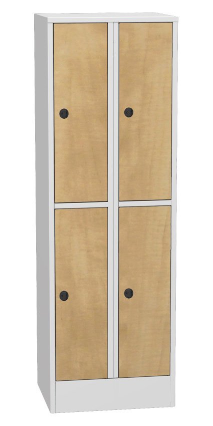 Szafka metalowa BHP czterodrzwiowa dzielona, szerokość 600, wysokość 1850, głębokość 500 mm. Korpus metalowy w kolorze jasnoszarym RAL 7035, drzwi laminowane we wzorze buku, brzozy lub wiśni. Zamek bębenkowy z dwoma kluczami lub zamknięciem na kłódkę. Wyposażenie wewnętrzne każdego schowka - drążek z trzema przesuwanymi haczykami.