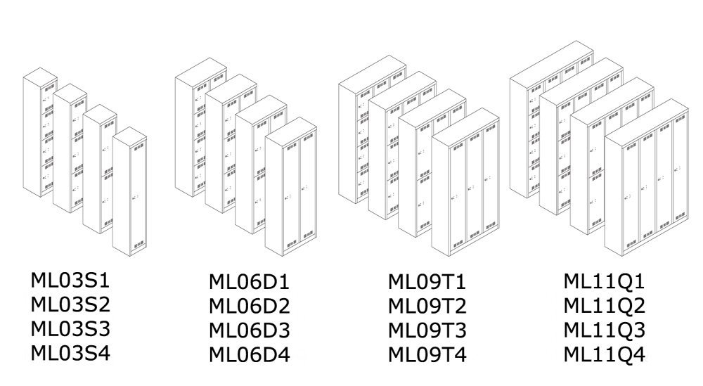Szafka spawana z drzwiami dzielonymi, 3 schowki. Modele na cokole lub na nogach. Szerokość schowka 300 mm, wysokość 1700 mm, z cokołem 1806 mm, z nogami 1850 mm, z podstawą ławki 2100 mm. Ławka standardowo wyposażona jest w nóżki rektyfikacyjne. Zamek cylindryczny, za dopłatą - na kłódkę lub zamek szyfrowy obrotowy. Kolor korpusu jasnoszary (RAL 7035), kolor drzwi do wyboru.