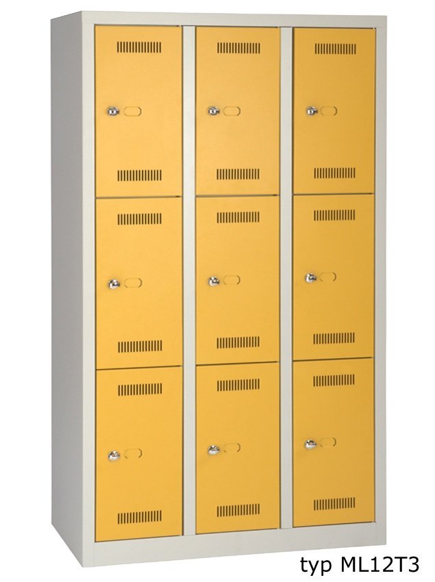 Szafka spawana z drzwiami dzielonymi, 3 schowki. Modele na cokole lub na nogach. Szerokość schowka 400 mm, wysokość 1700 mm, z cokołem 1806 mm, z nogami 1850 mm, z ławką bazową 2100 mm. Ławka standardowo wyposażona jest w nóżki rektyfikacyjne. Zamek cylindryczny, za dopłatą - na kłódkę lub zamek szyfrowy obrotowy. Kolor korpusu jasnoszary (RAL 7035), kolor drzwi do wyboru.