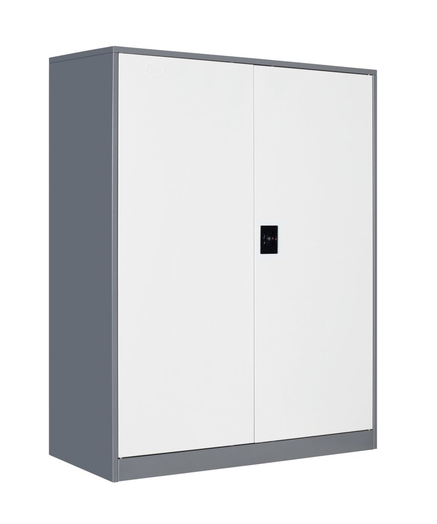 Dwudrzwiowa szafa biurowa (do samodzielnego montażu) wykonana z blachy stalowej o grubości 0,6 mm. Wysokość 1850 x szerokość 900 x głębokość 390 mm, 4 x półki, zamek bębenkowy z kółkiem i dwoma kluczami. Obróbka powierzchni farbą proszkową - korpus w kolorze ciemnoszarym, drzwi białe.