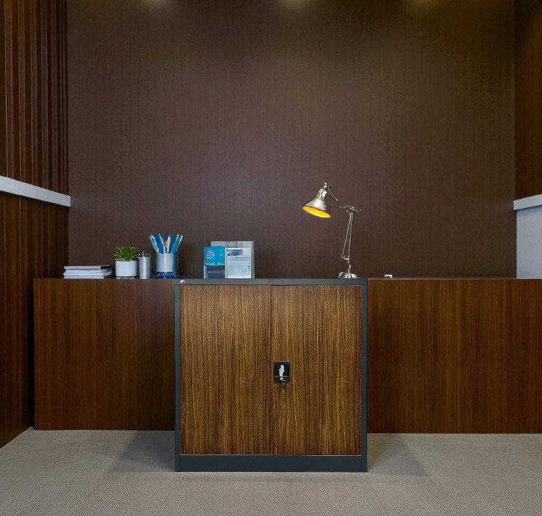 Szafka biurowa metalowa z półkami C01B biała / imitacja jasnego drewna406,00 Zł bez podatku VAT