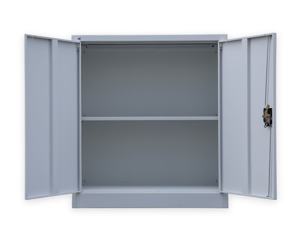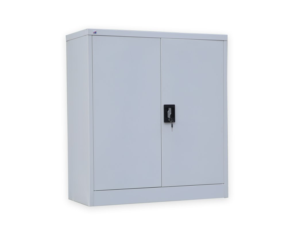Dwudrzwiowa szafa biurowa metalowa demontowana wykonana z blachy stalowej o grubości 0,6 mm. Wysokość 1000 x szerokość 900 x głębokość 400 mm, 1x półki, zamek bębenkowy z dwoma kluczami. Obróbka powierzchni farbą proszkową.