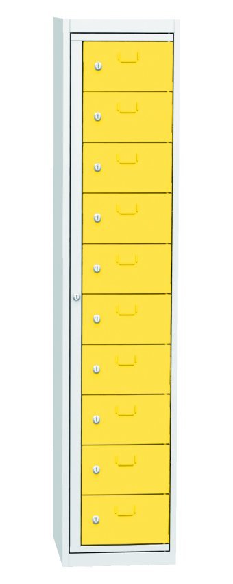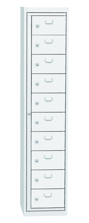 Szafa do wydawania czystej odzieży roboczej, szerokość 380, wysokość 1770, głębokość 460 mm. Zawiera dziesięć pudełek dozujących i jedną ramę centralną dla operatora. Każda skrzynka dozująca oraz centralna rama operatora zamykane są na zamek bębenkowy. Kolor korpusu RAL 7035 jasnoszary.
