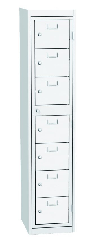 Szafa do wydawania czystej odzieży roboczej, szerokość 380, wysokość 1770, głębokość 460 mm. Zawiera siedem pudełek dozujących i jedną ramę centralną dla operatora. Każda skrzynka dozująca oraz centralna rama operatora zamykane są na zamek bębenkowy. Kolor korpusu RAL 7035 jasnoszary.
