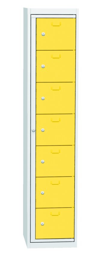 Szafa do wydawania czystej odzieży roboczej, szerokość 380, wysokość 1770, głębokość 460 mm. Zawiera siedem pudełek dozujących i jedną ramę centralną dla operatora. Każda skrzynka dozująca oraz centralna rama operatora zamykane są na zamek bębenkowy. Kolor korpusu RAL 7035 jasnoszary.