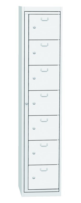Szafa do wydawania czystej odzieży roboczej, szerokość 420, wysokość 1980, głębokość 500 mm. Zawiera siedem pudełek dozujących i jedną ramę centralną dla operatora. Każda skrzynka dozująca oraz centralna rama operatora zamykane są na zamek bębenkowy. Kolor korpusu RAL 7035 jasnoszary.