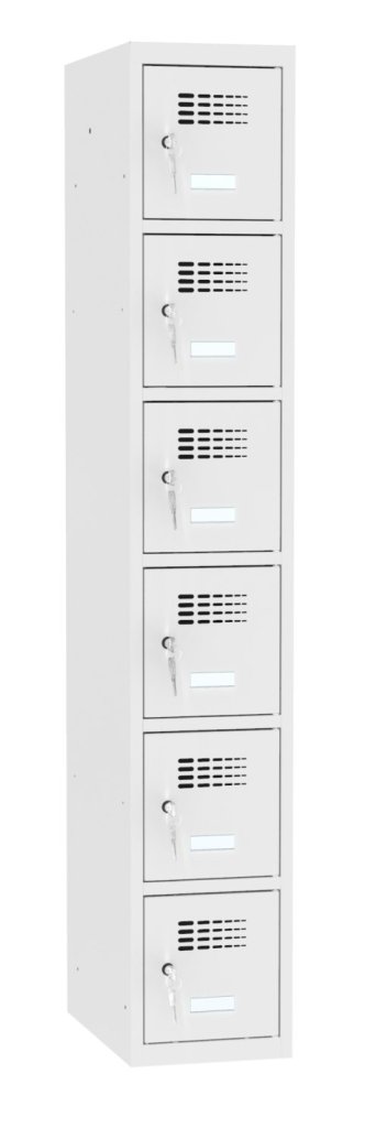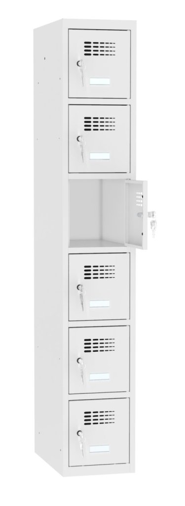 Sześciodrzwiowa szafka metalowa o konstrukcji spawanej z nowoczesnym systemem wentylacji. Wysokość 1800 x szerokość 300 x głębokość 500 mm. Samoprzylepna plakietka imienna na drzwiach. Do wyboru 16 odcieni kolorystycznych bez dopłaty. Różne rodzaje zamków.