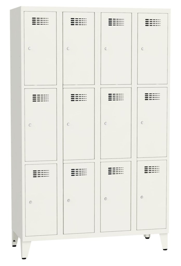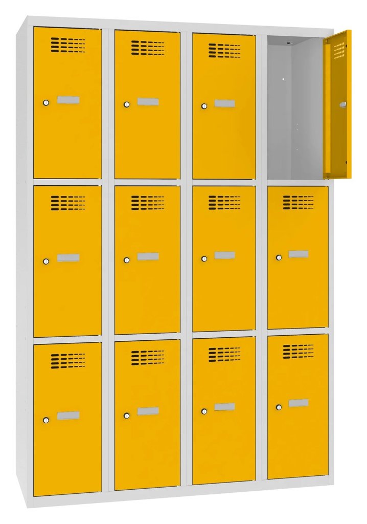 12-drzwiowa szafka metalowa o konstrukcji spawanej z nowoczesnym systemem wentylacji. Wysokość 1800 x szerokość 1200 x głębokość 500 mm. Samoprzylepna plakietka imienna na drzwiach. Do wyboru 16 odcieni kolorystycznych wliczonych w cenę. Różne rodzaje zamków.
