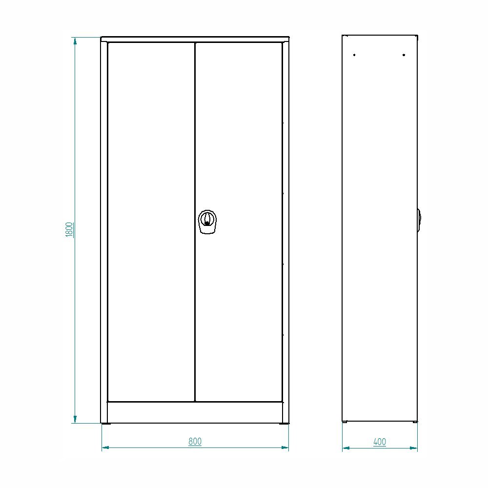 Szafa metalowa dwudrzwiowa z cokołem do szafy lub porządków, szerokość 800, wysokość 1950, głębokość 400 mm, 5 półek. Możliwość wymiany drzwi pełnych na drzwi z wypełnieniem szklanym, z wypełnieniem drucianym lub drzwi laminowane w odcieniu buku, brzozy lub wiśni. Kolor korpusu RAL 7035 jasnoszary.