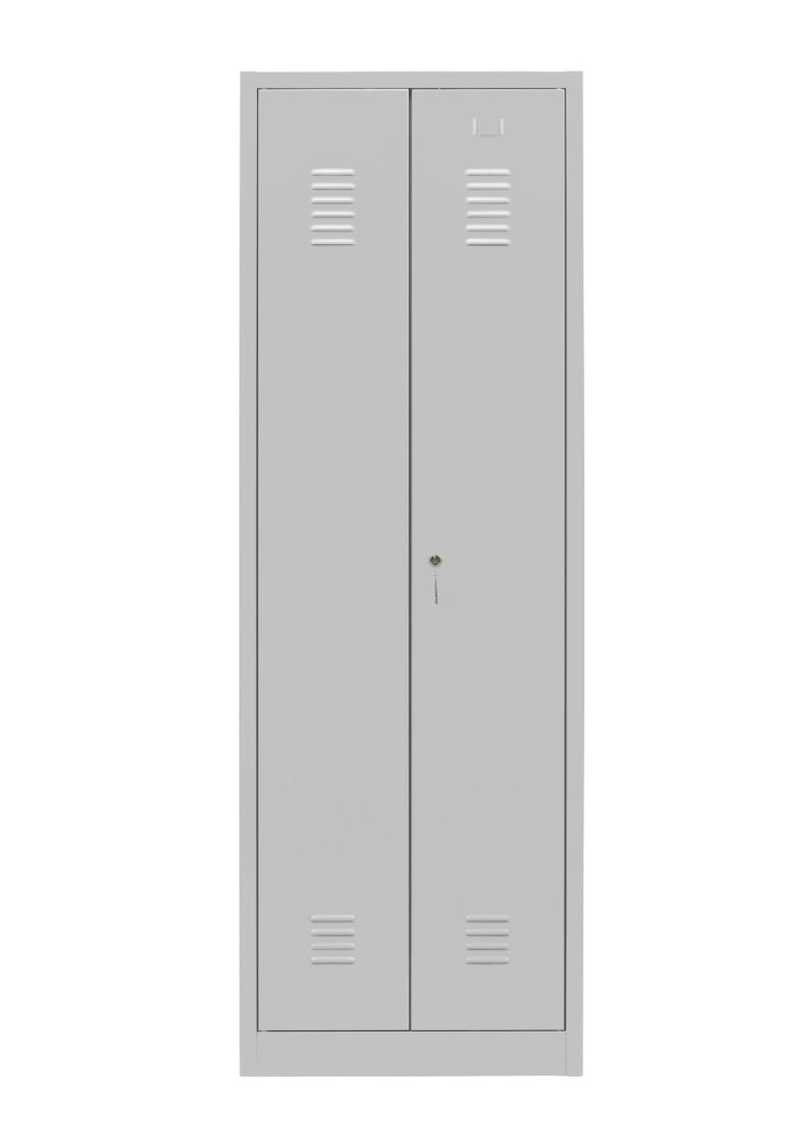 Szafa gospodarcza o konstrukcji stalowej. Po lewej stronie - 4 półki, po prawej drążek z przesuwanymi haczykami i 1 półką. Zamek bębenkowy. Kolor korpusu i drzwi szary RAL 7035. Wysokość 1800 mm x szerokość 600 mm x głębokość 500 mm.
