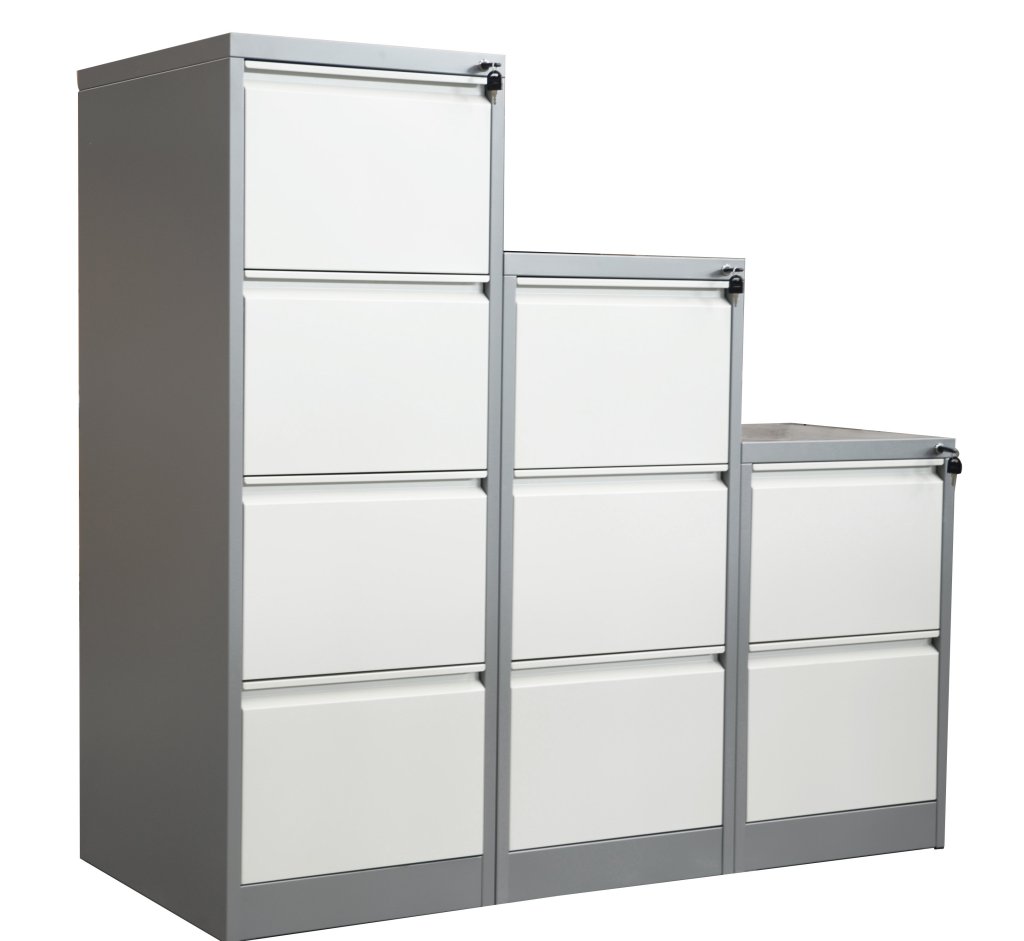 Szafka na dokumenty do samodzielnego montażu z trzema szufladami, wykonana z blachy stalowej o grubości 0,6 mm. Wysokość 1015 x szerokość 400 x głębokość 600 mm, zamek centralny, pełny wysuw szuflad. Na dokumenty lub segregatory wiszące formatu A4. Korpus w kolorze szarym lub ciemnoszarym, szuflady białe.