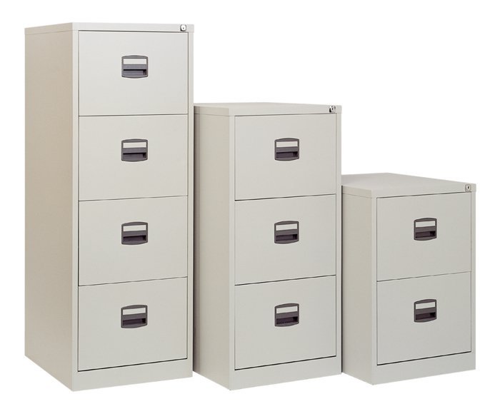 Szafa kartotekowa metalowa z czterema szufladami na dokumenty lub segregatory wiszące w formacie A4 lub Foolscap, szerokość 413 lub 470, wysokość 1321, głębokość 622 mm, zamek centralny, różne kolory.