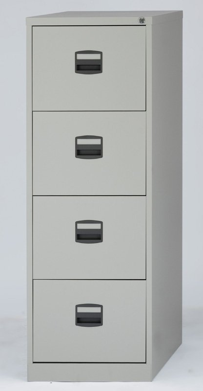 Szafa kartotekowa metalowa z czterema szufladami na dokumenty lub segregatory wiszące w formacie A4 lub Foolscap, szerokość 413 lub 470, wysokość 1321, głębokość 622 mm, zamek centralny, różne kolory.