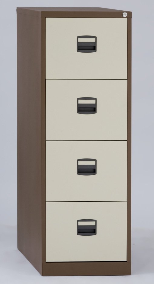 Szafa kartotekowa metalowa z czterema szufladami na dokumenty lub segregatory wiszące w formacie Foolscap, szerokość 470, wysokość 1321, głębokość 622 mm, zamek centralny, różne kolory.