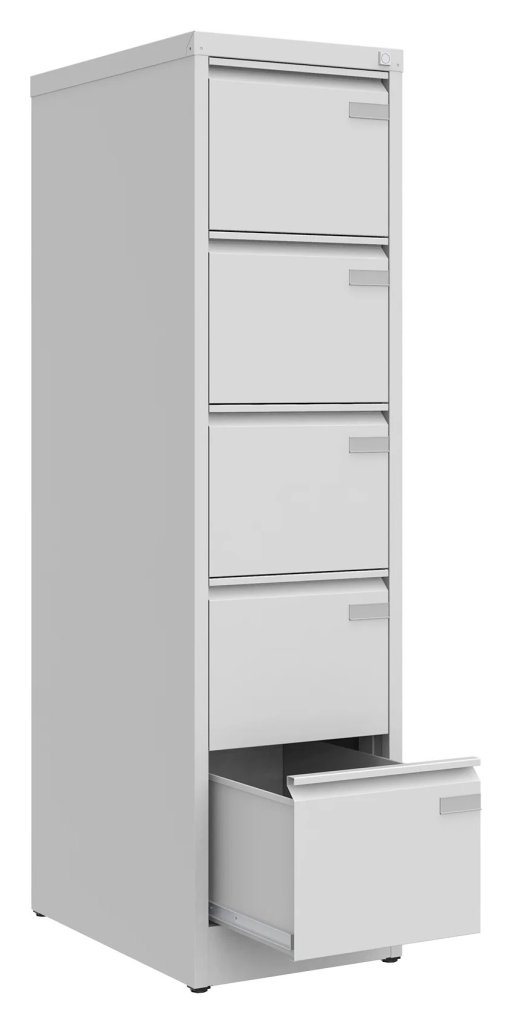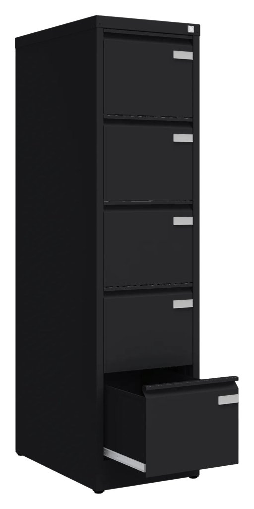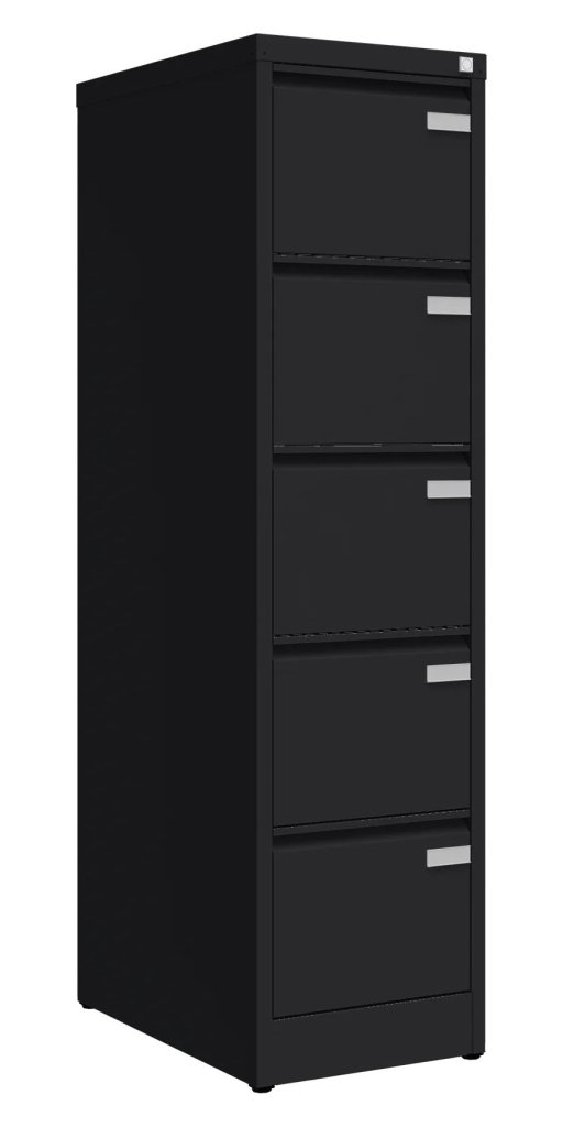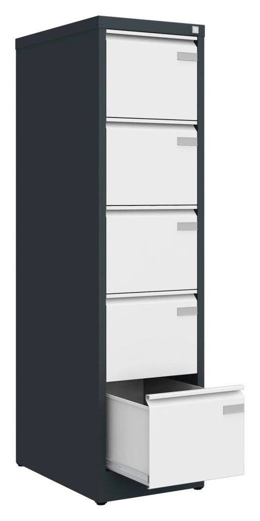 Szafa na dokumenty metalowa z pięcioma szufladami lub kieszeniami wiszącymi w formacie A4, Folio lub Foolscap, szerokość 470, wysokość 1511, głębokość 622 mm, zamek centralny, różne kolory, uchwyty standardowe (występ). Szafka na dokumenty służy przede wszystkim do przechowywania szerszych formatów Foolscap, ale każda szuflada jest wyposażona w szynę redukcyjną do przechowywania kieszeni wiszących A4 lub Folio.