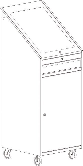 Obudowa komputera wykonana z blachy stalowej o grubości 0,8 mm. 1 drzwi, 1 stała półka na klawiaturę i mysz, przedłużacz z 4 gniazdami, wentylator. W szafce można umieścić ekran LCD o przekątnej do 17 cali. Wymiary w mm (wys. x szer. x gł.) 1600 x 550 x 550.