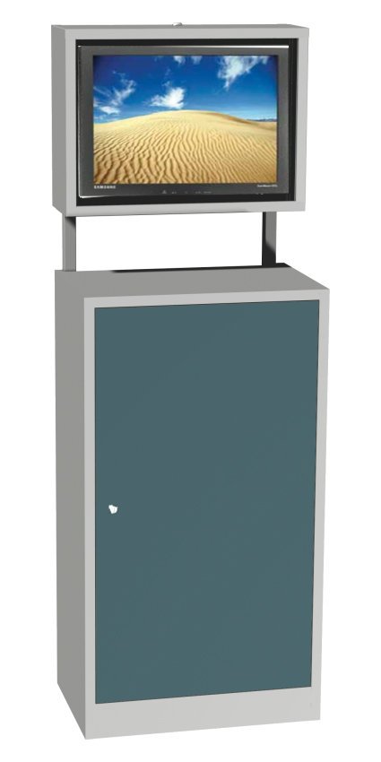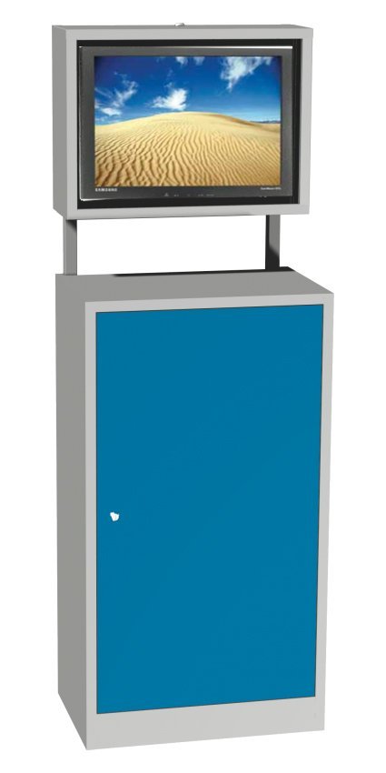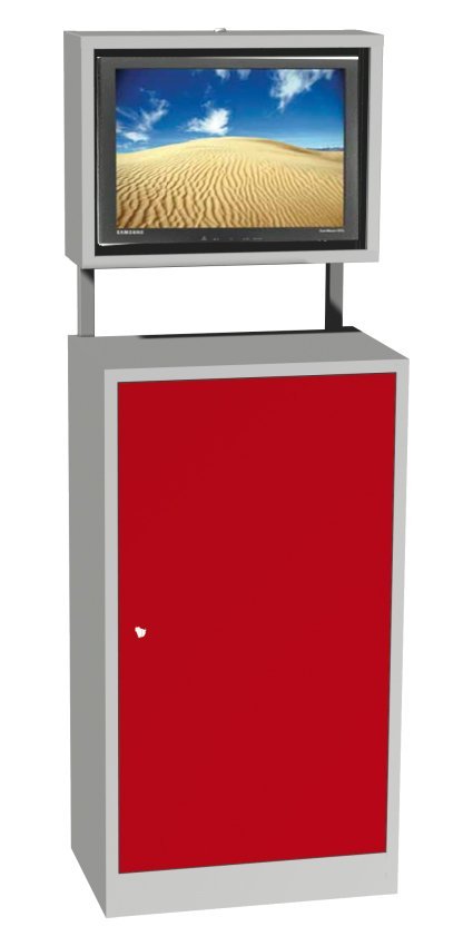 Szafa na komputer z zamykanymi drzwiami, jedną regulowaną półką, wysuwaną szufladą na drukarkę i wysuwaną półką na klawiaturę za drzwiami na zawiasach. Wysokość 1850 x szerokość 610 x głębokość 600 mm, waga 75,6 kg. Kolor korpusu RAL 7035 jasnoszary.