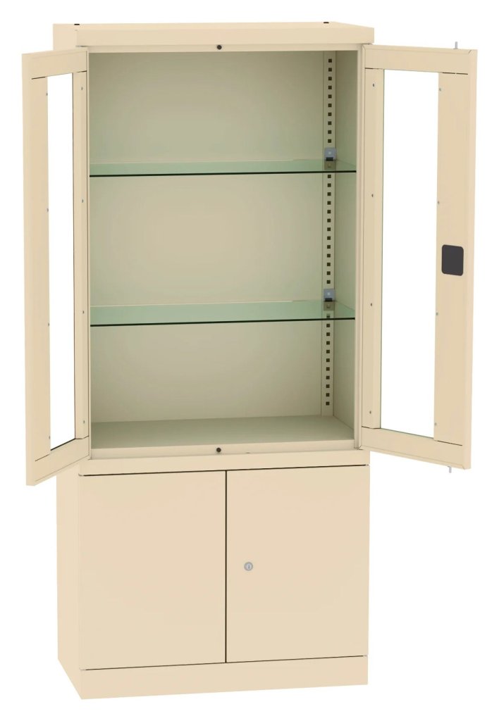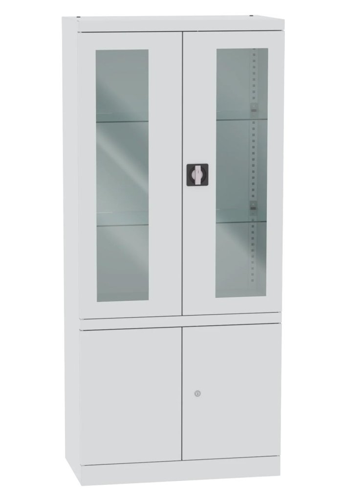Szafka lekarska z drzwiami szklanymi i pełnymi, wysokość 1800 x szerokość 800 x głębokość 435 mm. Zamek dwupunktowy. 3x regulowana półka szklana (nośność 25 kg) regulowana w odstępach co 25 mm. Szklane drzwi i szklane półki wykonane są ze szkła hartowanego.