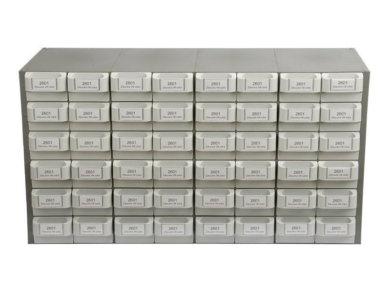 Zestaw znajdzie zastosowanie głównie w magazynach drobnych materiałów. Jest doskonałym pomocnikiem we wprowadzaniu i utrzymywaniu zasad metodologii 5S. Szafka zawiera łącznie 48 szuflad 2601. Wykonana z ABS. Obudowa szafy zawsze jest w kolorze szarym. Gniazda dostępne są w kolorze czarnym, szarym, niebieskim, czerwonym. Poszczególne szafy można łączyć ze sobą za pomocą złączy U, H lub I (2633, 2634 lub 2635).
