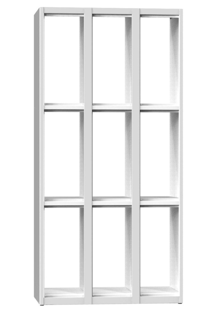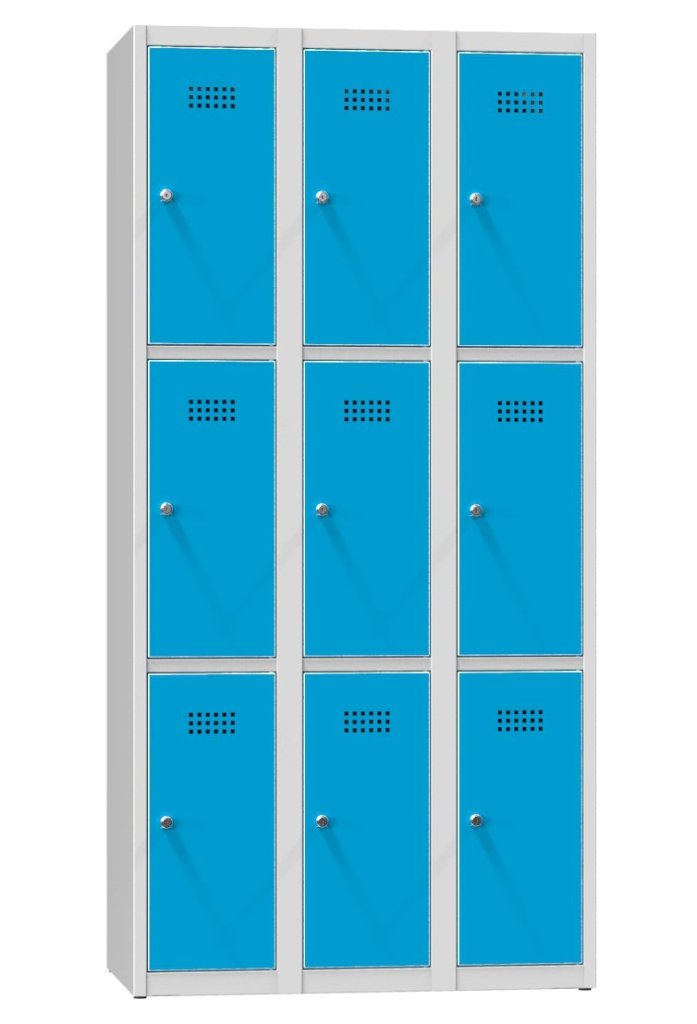 Szafka metalowa z dziewięcioma zamykanymi schowkami, szerokość 900, wysokość 1850, głębokość 500 mm. Szerokość każdego schowka 300 mm, standardowy zamek można zastąpić kłódką lub zamkiem na monety. Kolor korpusu RAL 7035 jasnoszary.