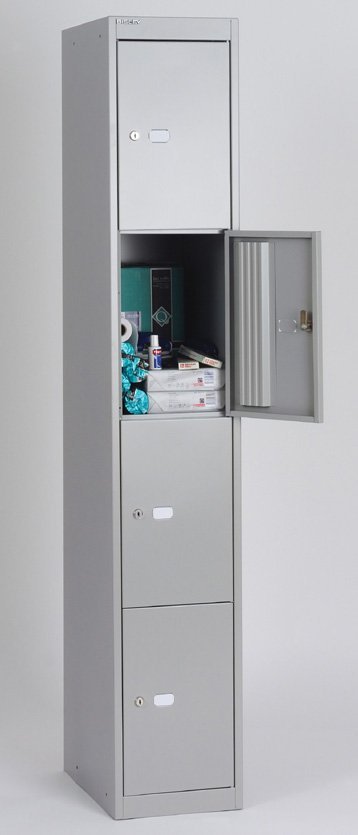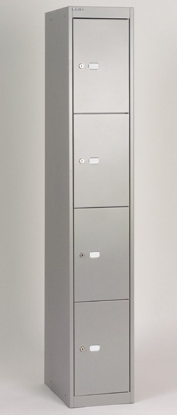 Szafka metalowa czterodrzwiowa, szerokość 305, wysokość 1802, głębokość 457 mm. Zamknięcie na zamek bębenkowy z dwoma kluczami z możliwością wymiany na kłódkę lub zamek szyfrowy.