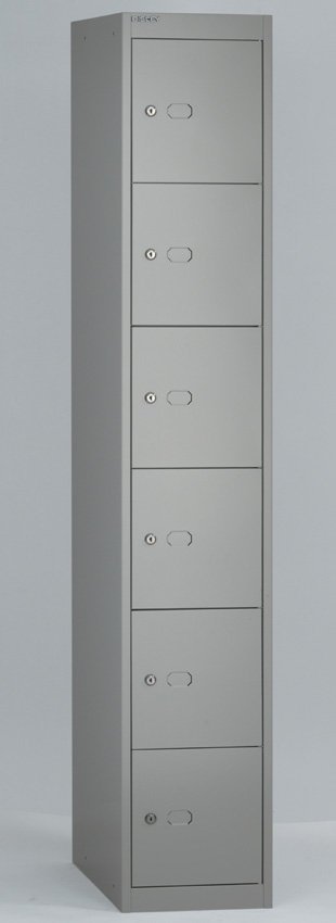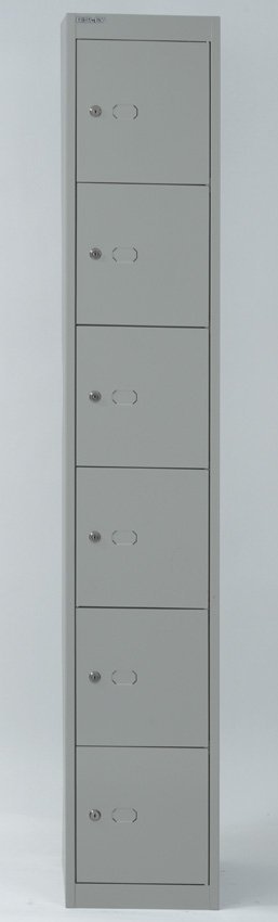 Szafka metalowa, sześciodrzwiowa, szerokość 305, wysokość 1802, głębokość 305 mm. Zamek bębenkowy z dwoma kluczami z możliwością wymiany na kłódkę lub zamek szyfrowy.