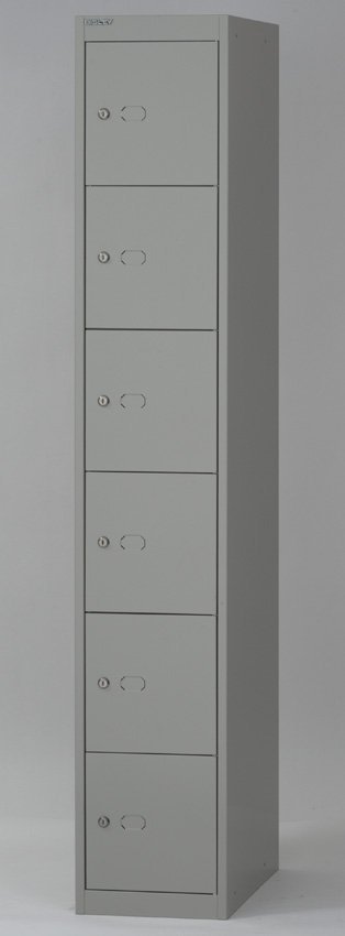 Szafka metalowa sześciodrzwiowa, szerokość 305, wysokość 1802, głębokość 457 mm. Zamek bębenkowy z dwoma kluczami z możliwością wymiany na kłódkę lub zamek szyfrowy.
