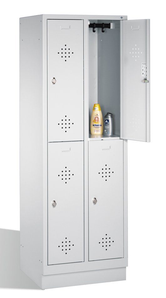 Szafka metalowa pracownicza czterodrzwiowa, dzielona, szerokość 600, wysokość 1850, głębokość 500 mm, w górnej części każdego schowka znajduje się drążek z trzema plastikowymi przesuwanymi haczykami. Kolor korpusu RAL 7035 jasnoszary.