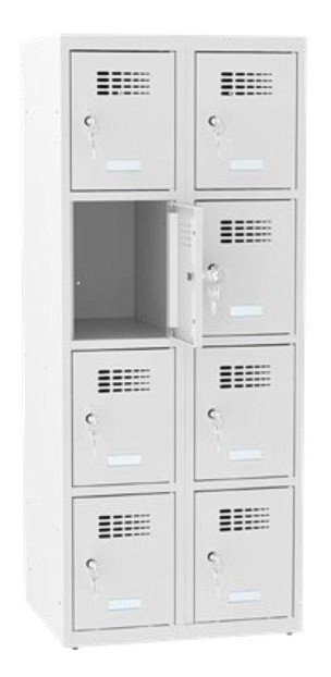 Ośmiodrzwiowa szafka metalowa o obniżonej wysokości, z nowoczesnym systemem wentylacji. Wysokość 1450 x szerokość 600 x głębokość 500 mm. Samoprzylepna plakietka imienna na drzwiach. Do wyboru 16 odcieni kolorystycznych wliczonych w cenę. Różne rodzaje zamków.